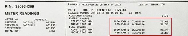 You want to total your energy charge and your fuel charge below and above 1000 kWh, leaving out any customer charges, late fees, discounts, or rebates.
