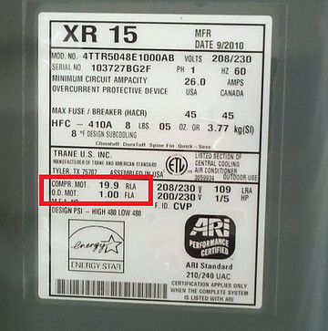 This second method involves looking at your air conditioner. The rated load amperage (RLA) is the the maximum number of amps that your compressor can use when running. The full load amps (FLA) is the max amperage the indoor and outdoor motors use when running. Technically, these motors should always be using less than these numbers, but if you do not know how many amps they are actually using, these numbers can be a good guide. It can be found on your condenser and air handler data plate (see pic). As you can see, the RLA for this unit is 19.9 amps and the FLA is 1.0 amps. These can be added together along with the FLA of the indoor blower motor and can be used instead of the rough numbers given in the above method.