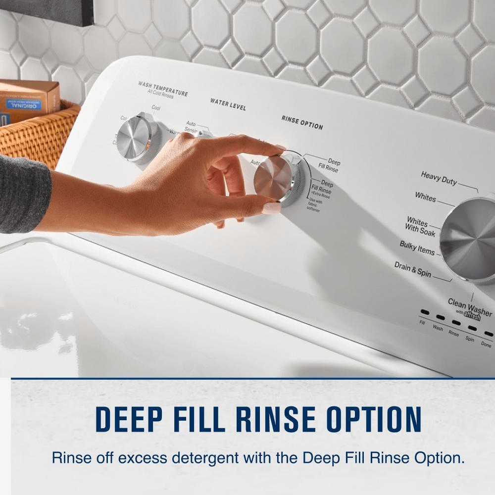 Maytag says the Deep Fill Option gives you more water when you want it, helping saturate loads and soak away tougher messes. The washer also includes a Deep Fill Rinse Option to help rinse away excess detergent and fabric softener.